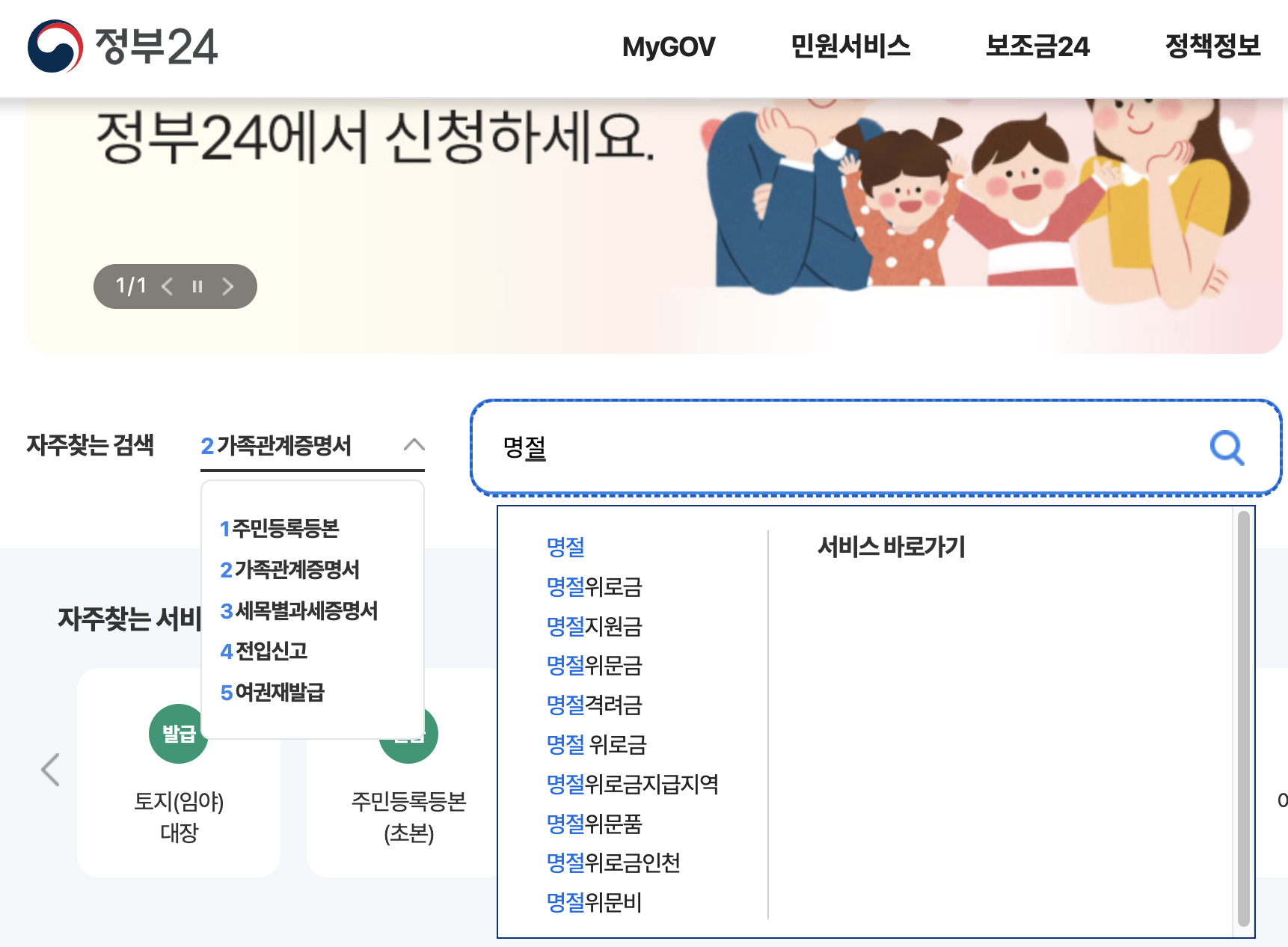 정부24 홈페이지에 접속하시면 '찾으시는 서비스를 입력하세요' 검색창에 '명절'이라고 검색 시 관련 정보가 바로 제공됩니다.